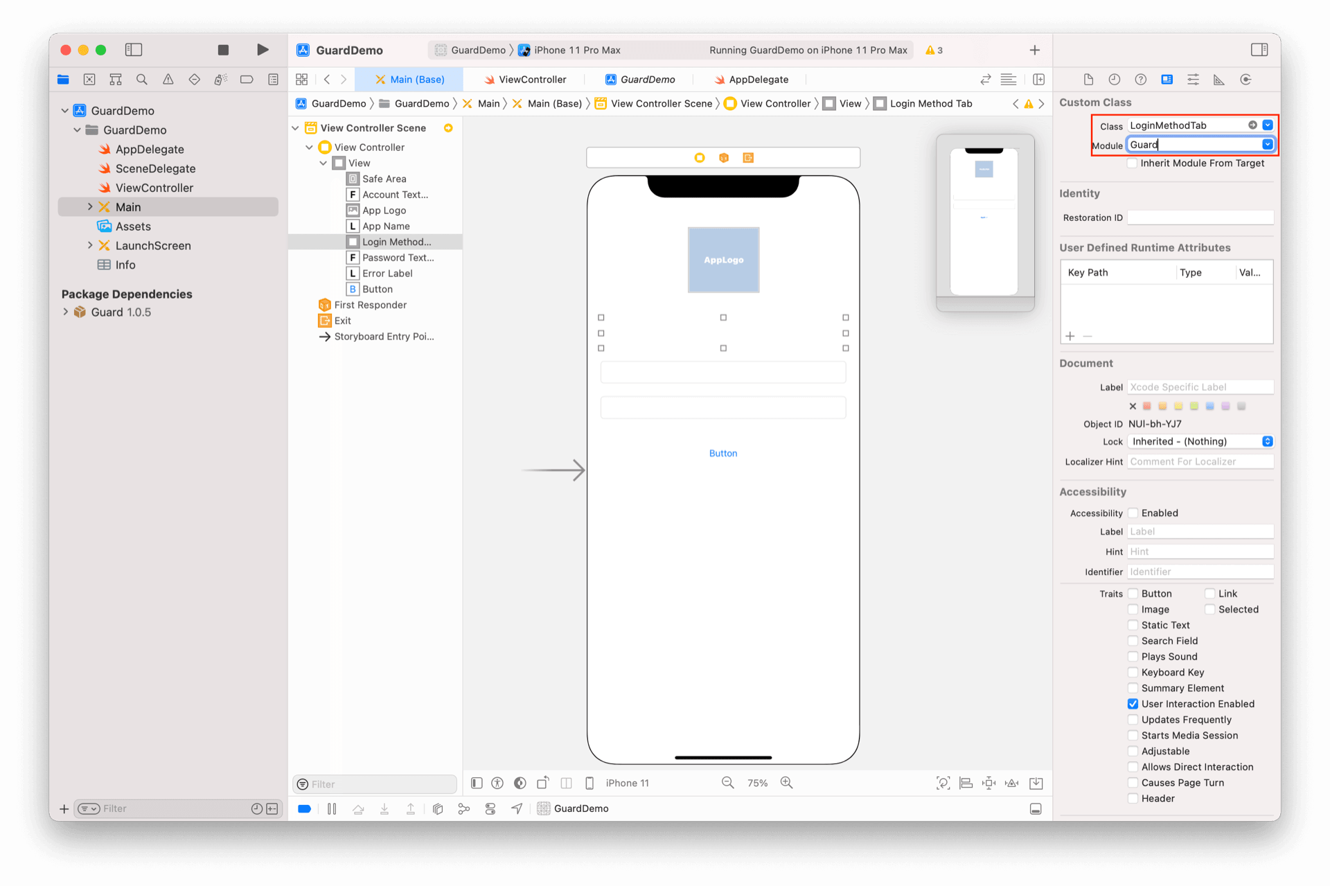 这时如果运行应用程序,会发现“密码登录”容器里面为空。因为 LoginContainer 默认类型为 0,表示通过手机号码+验证码登录,因此,我们需要将帐号密码登录的 LoginContainer 的类型改为 1。首先在 ViewController 里面声明一个 @IBOutlet 成员变量