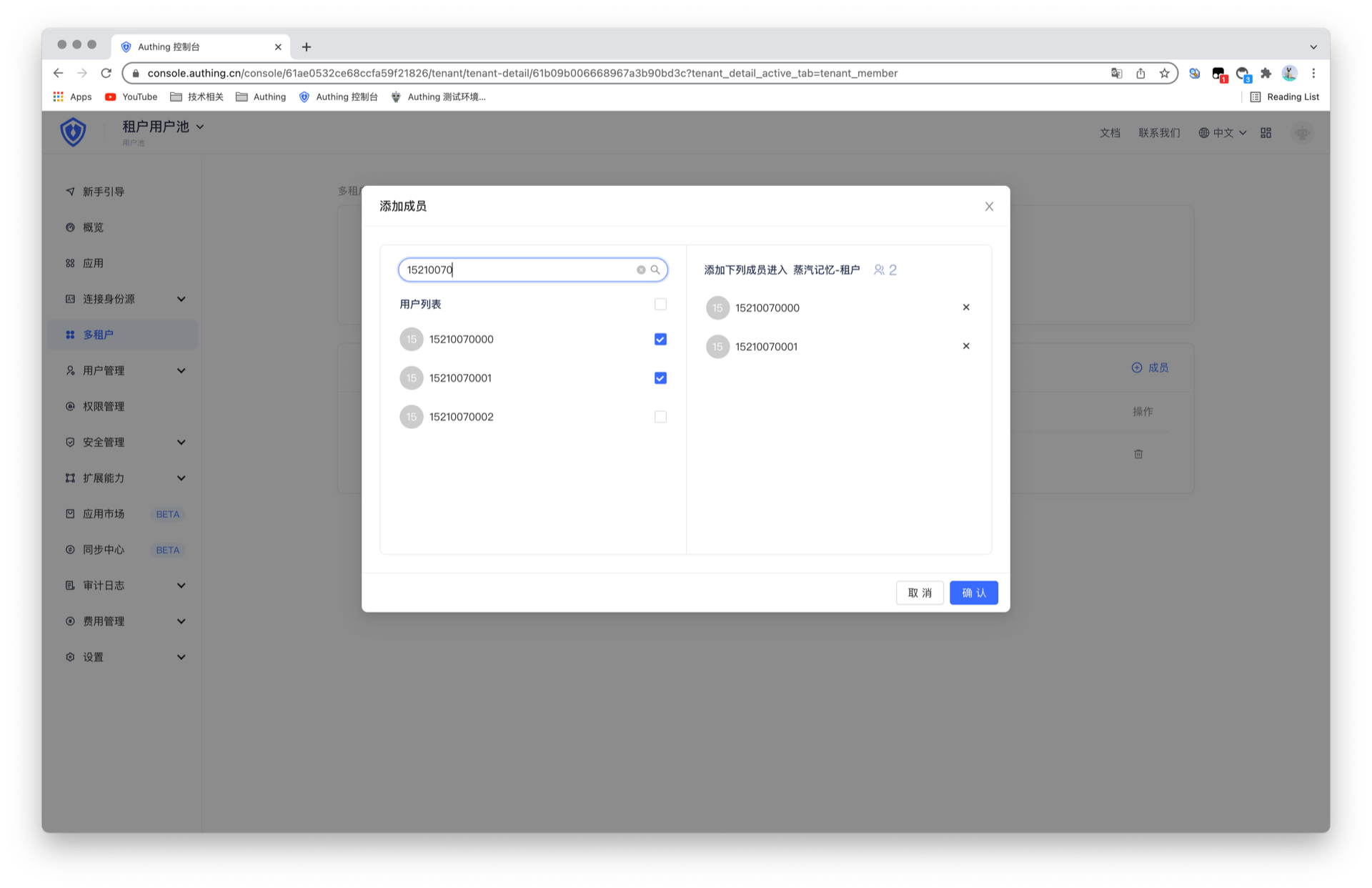 在租户配置页面的成员菜单下,你可以管理你的租户成员。管理员可以直接将用户池中原有的用户添加为租户成员。终端用户也可以在租户登录页注册,从而自动成为当前租户的成员。操作示意如下: