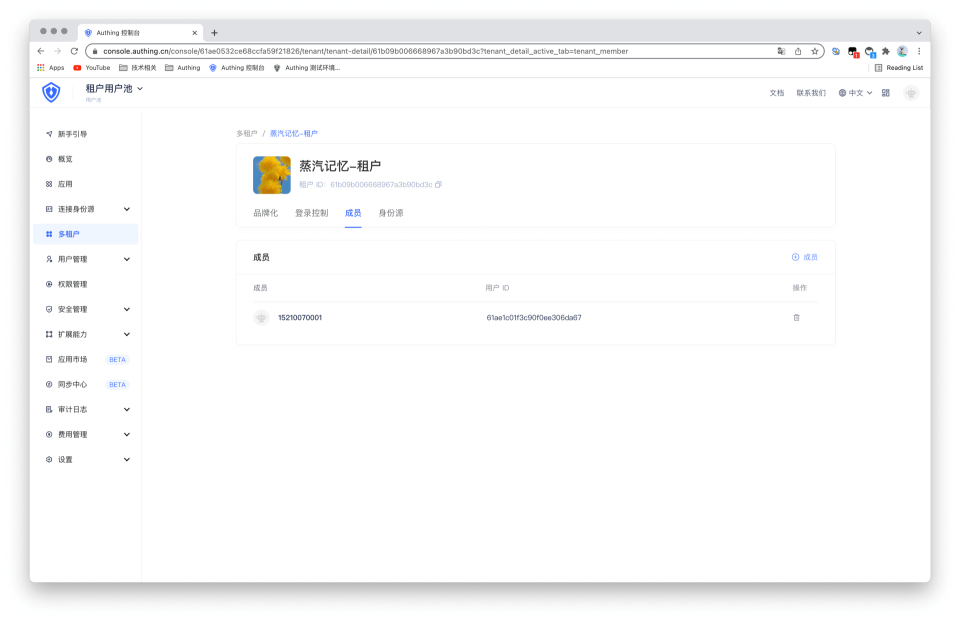 - 选择某一具体租户,选择成员,可以查看所有当前租户中的成员,也可以删除已添加的成员。