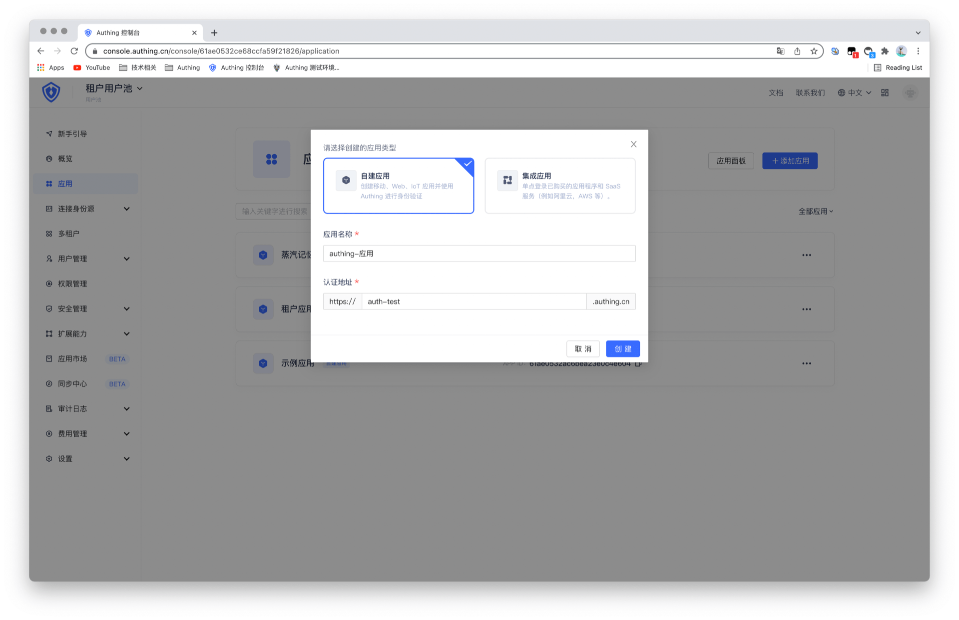 假如你还没有自建应用,请在 Authing 控制台上应用里点击添加应用,去创建一个自建应用。当前仅自建应用支持多租户功能。
