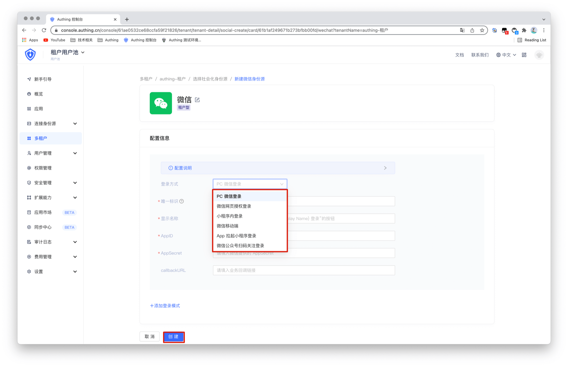 例如选择微信生态的第三方身份源,填写相关的配置信息。点击创建按钮即可保存该身份源。