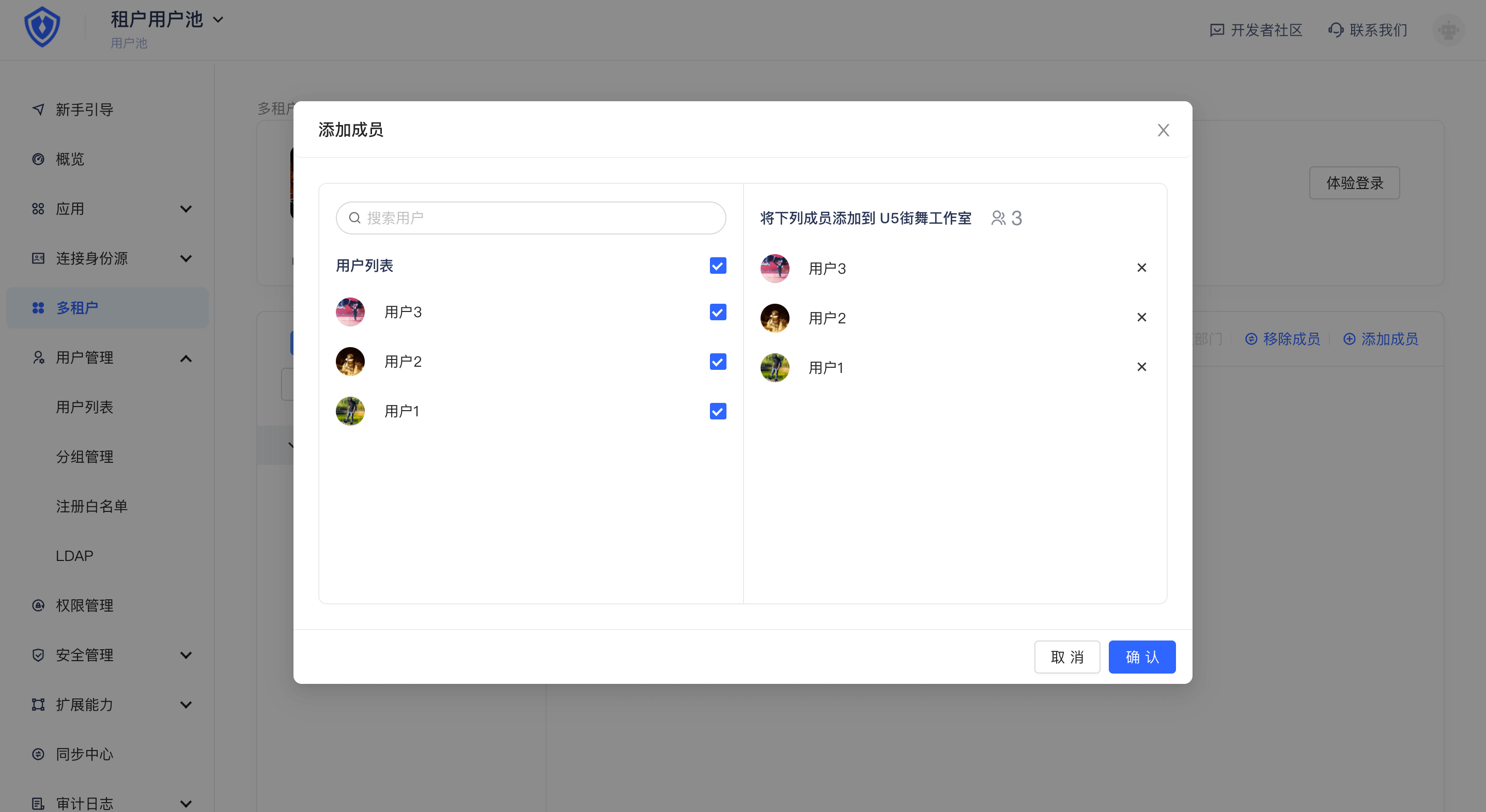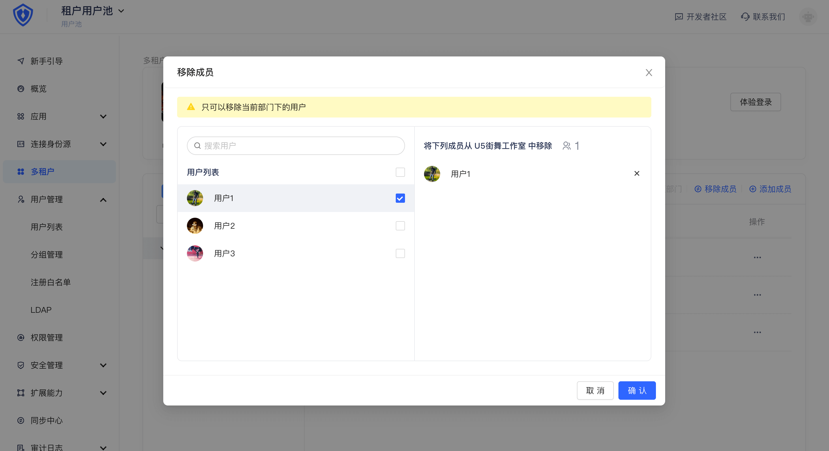 你可以按下图所示,添加移除组织机构成员。需要注意的是当你在用户池对租户下成员所对应的用户进行删除操作时,租户侧改成员也会被移除。