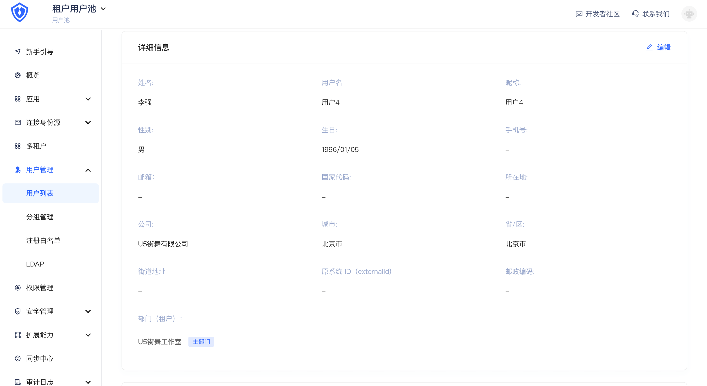 你可以在「用户详情」的「详细信息」卡片中,查看当前用户在各个租户下所属组织机构的信息。