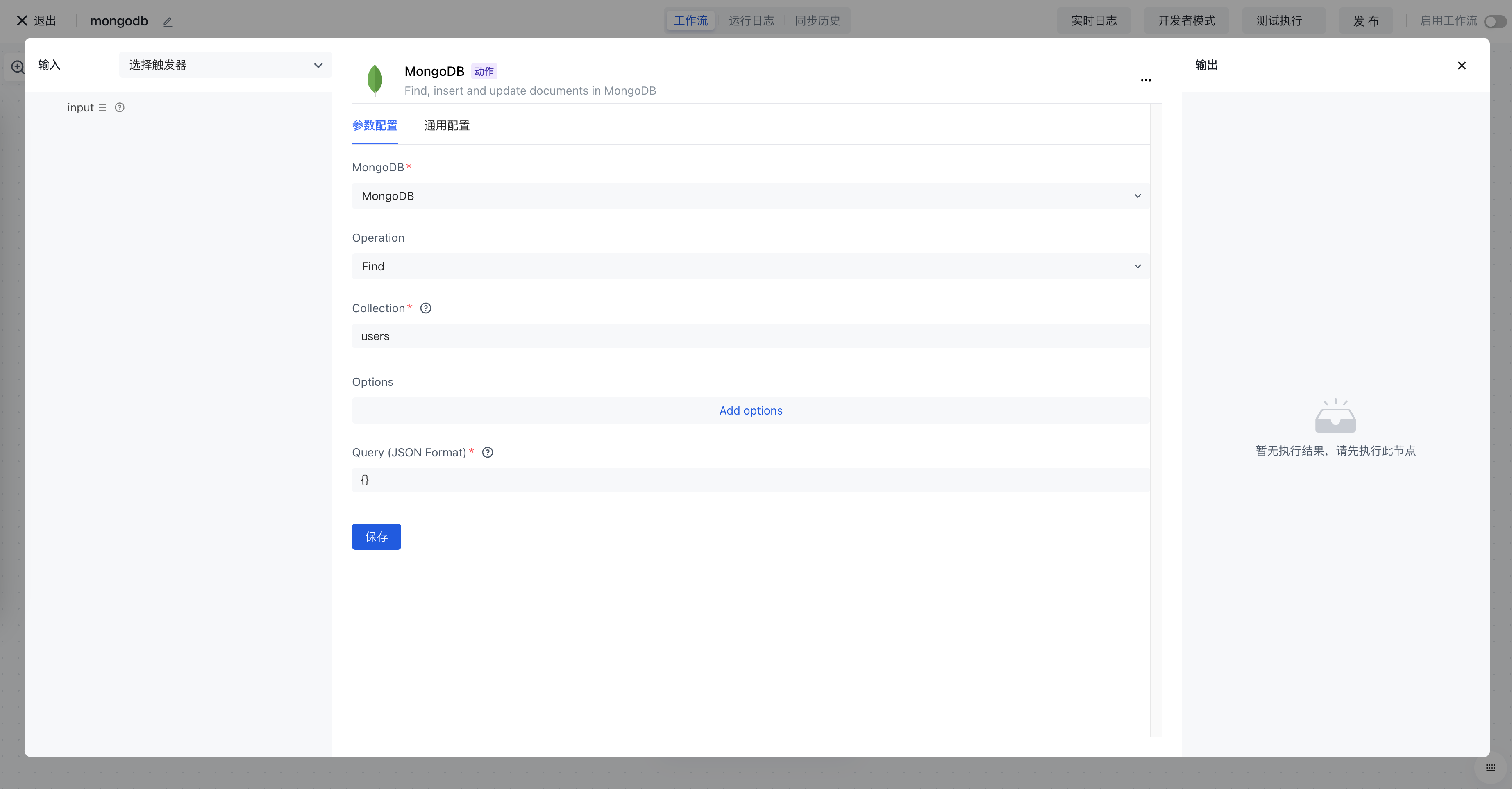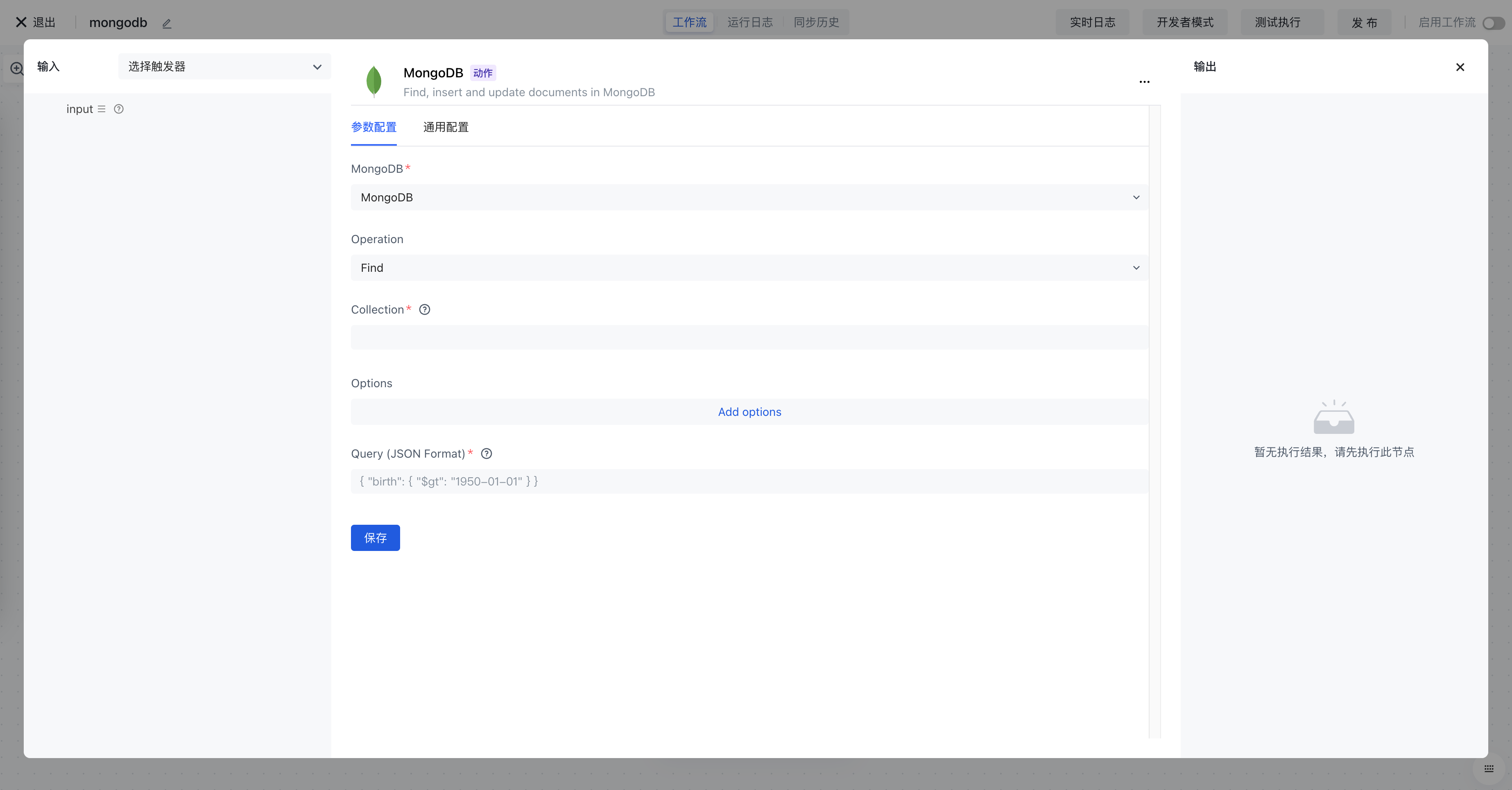 设置 MongoDB 节点的操作为 Find,Collection 设置为 Find、Query 查询语句设置为 {}: