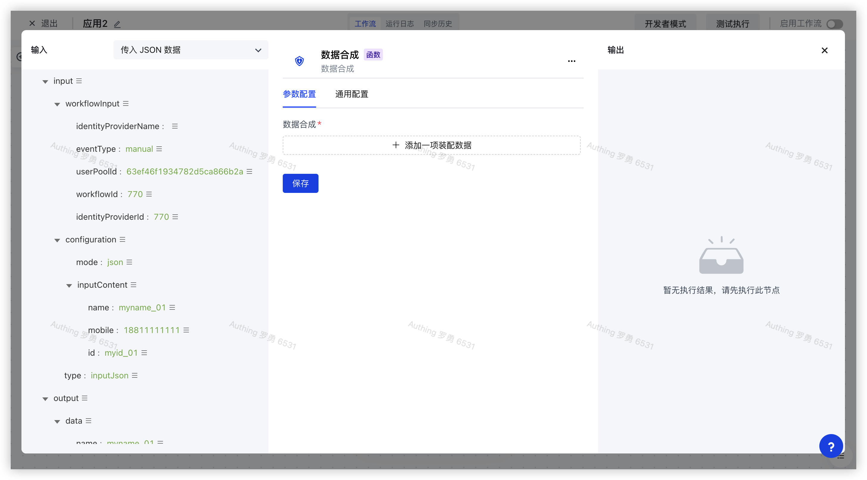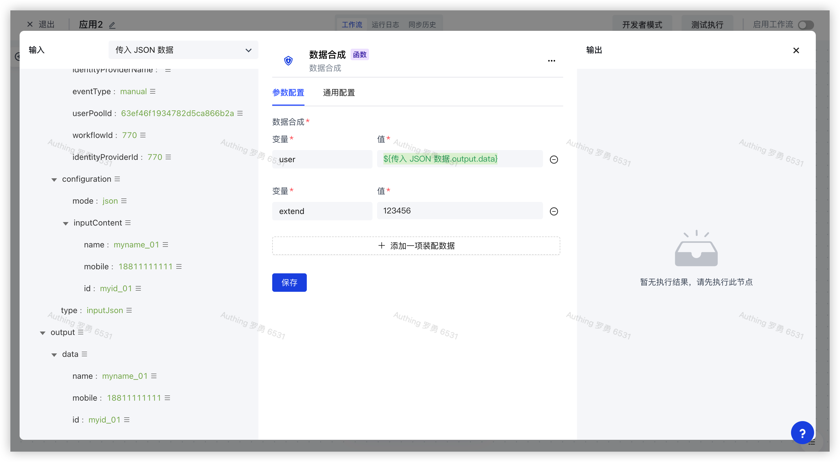 「数据合成」节点主要用于装配多个变量数据,以便于将这些变量合成一个输出结果,用于后续的节点处理。