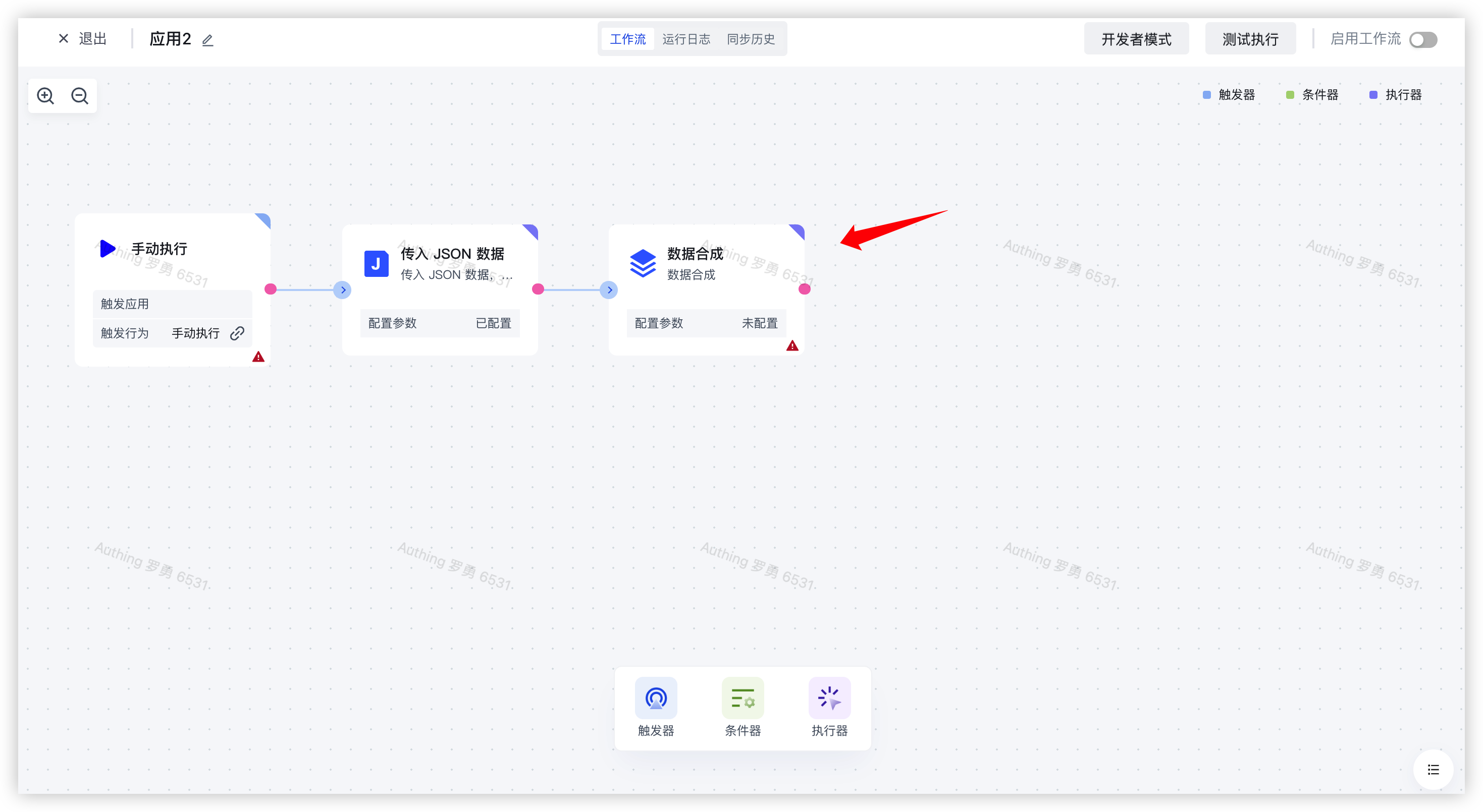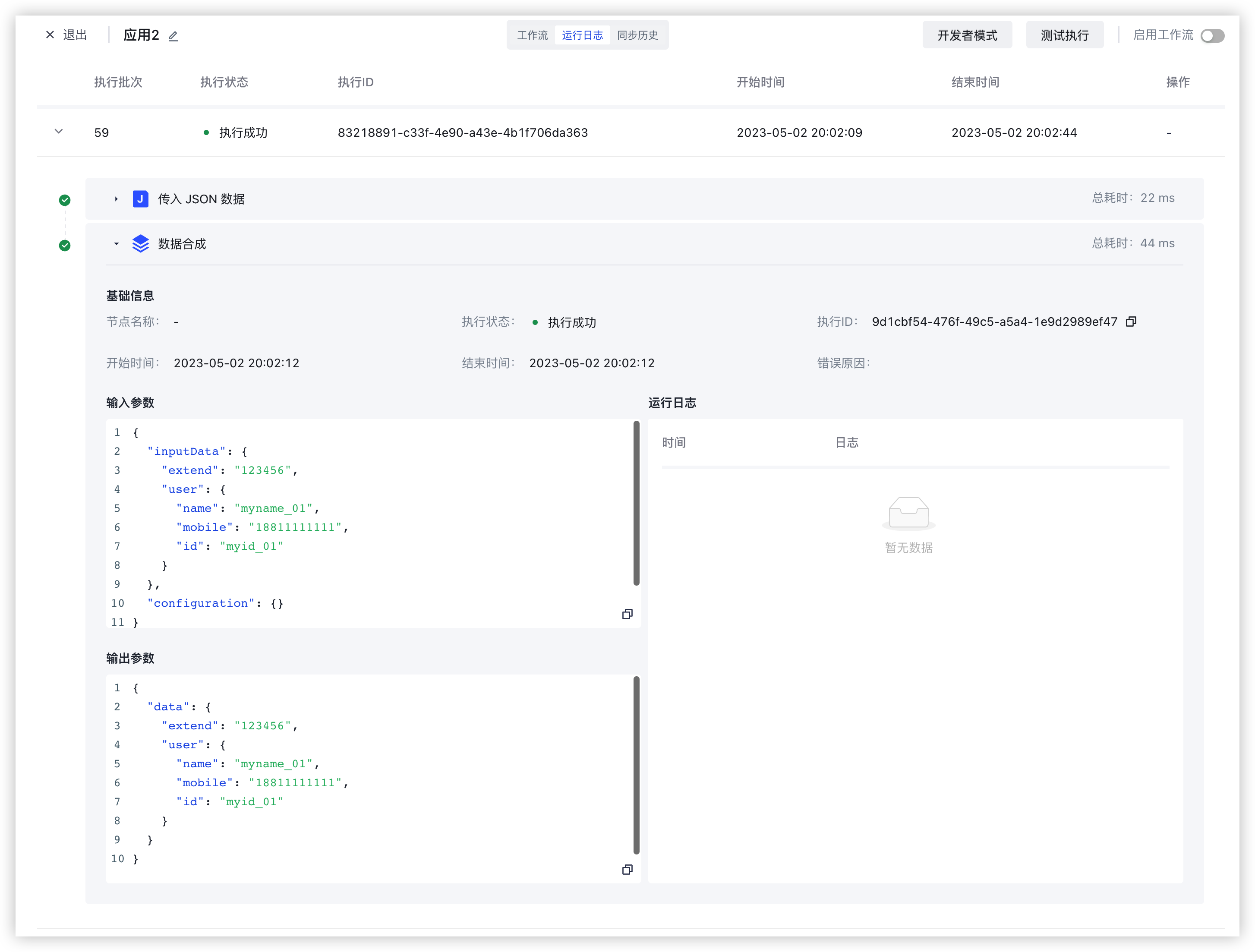 点击「运行日志」栏,依次点击最新的「执行批次」和「数据合成」节点左边的展开按钮,查看节点执行结果。