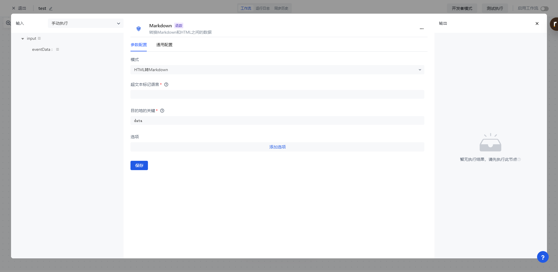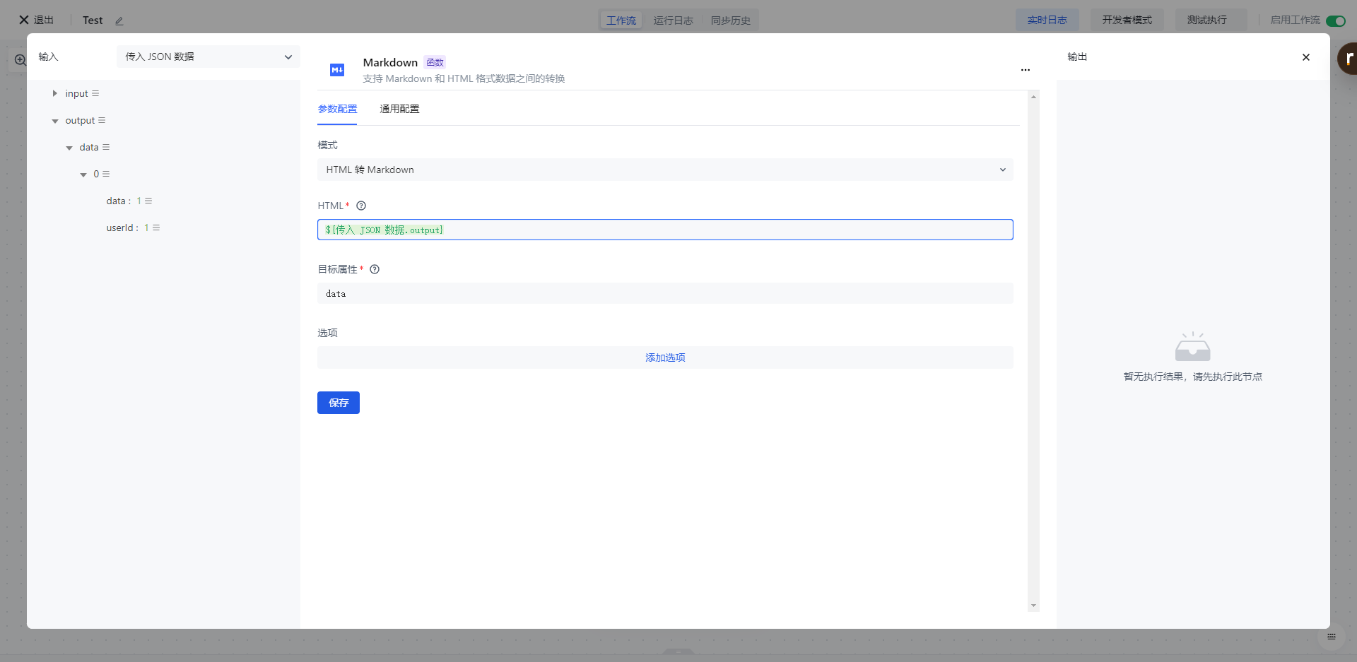 「Markdown」节点主要用于对源数据 HTML 转化 Markdown 以及 Markdown 转化 HTML。