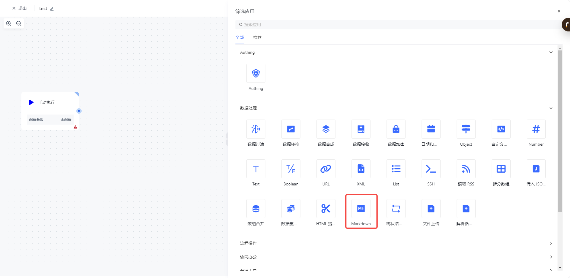 在添加节点页面,在「数据处理」分类中找到「Markdown」应用节点。