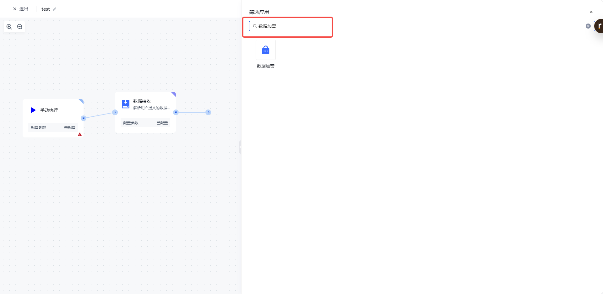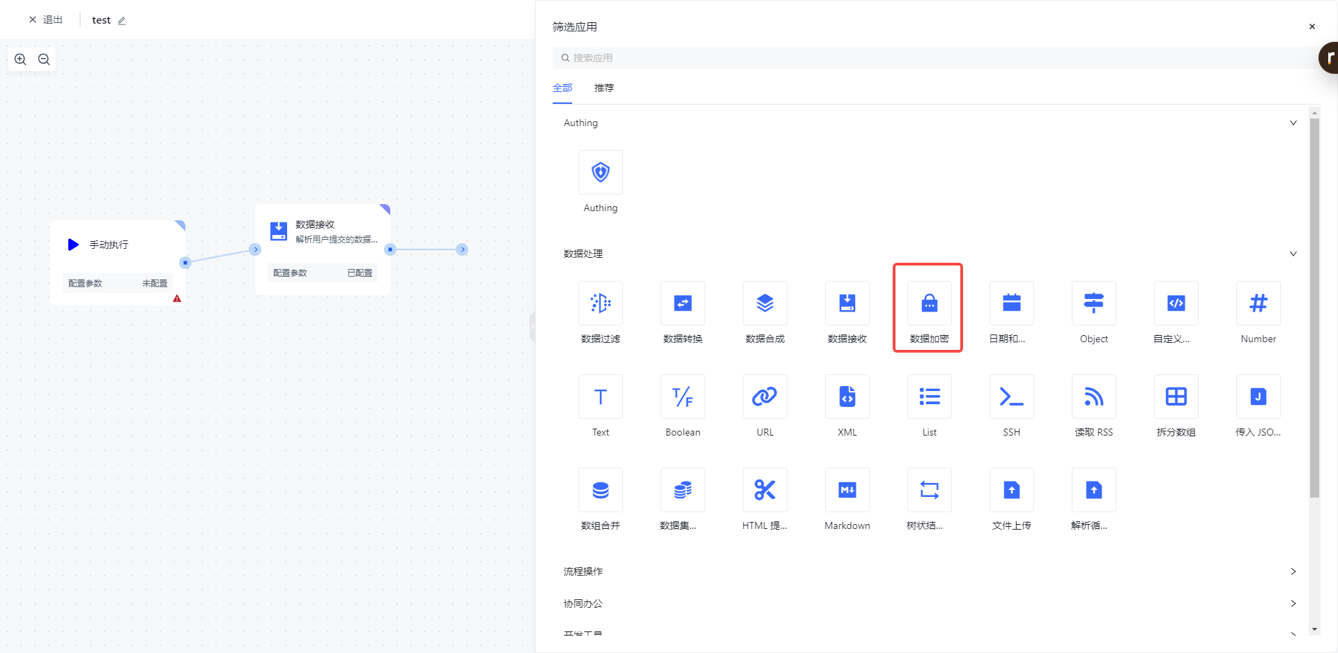 在添加节点页面,在「数据处理」分类中找到「数据加密」应用节点。