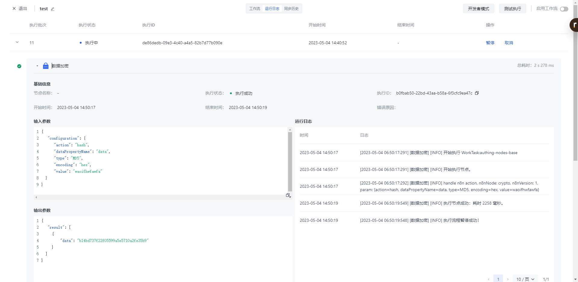 点击「运行日志」栏,依次点击最新的「执行批次」和「数据加密」节点左边的展开按钮,查看节点执行结果。