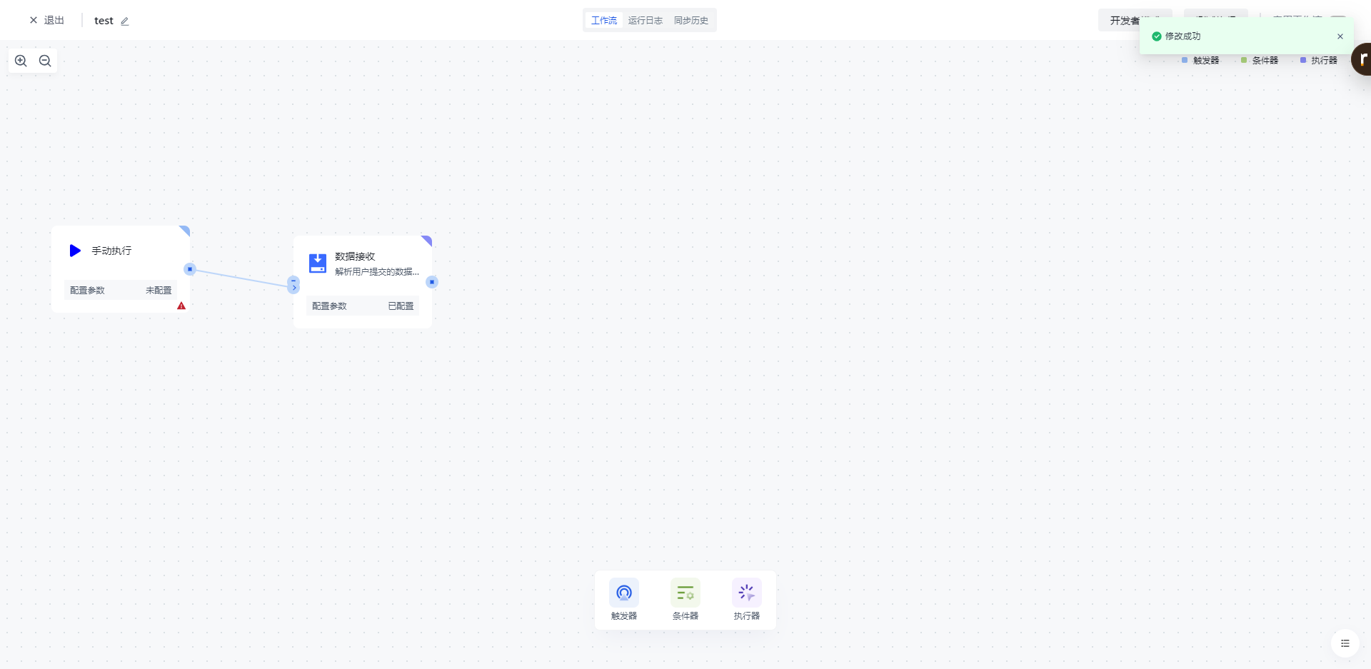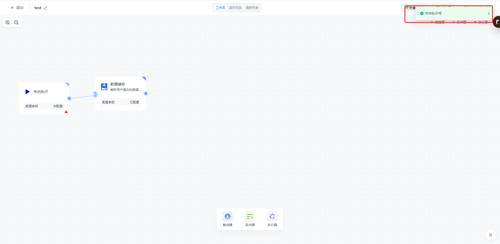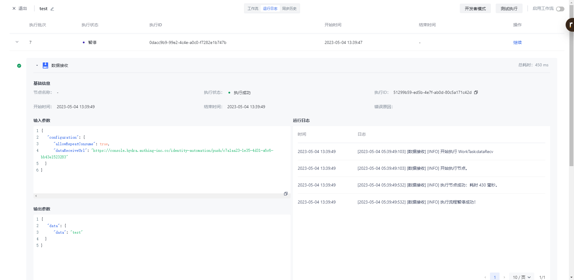 点击「运行日志」栏,依次点击最新的「执行批次」和「数据接收」节点左边的展开按钮,查看节点执行结果。