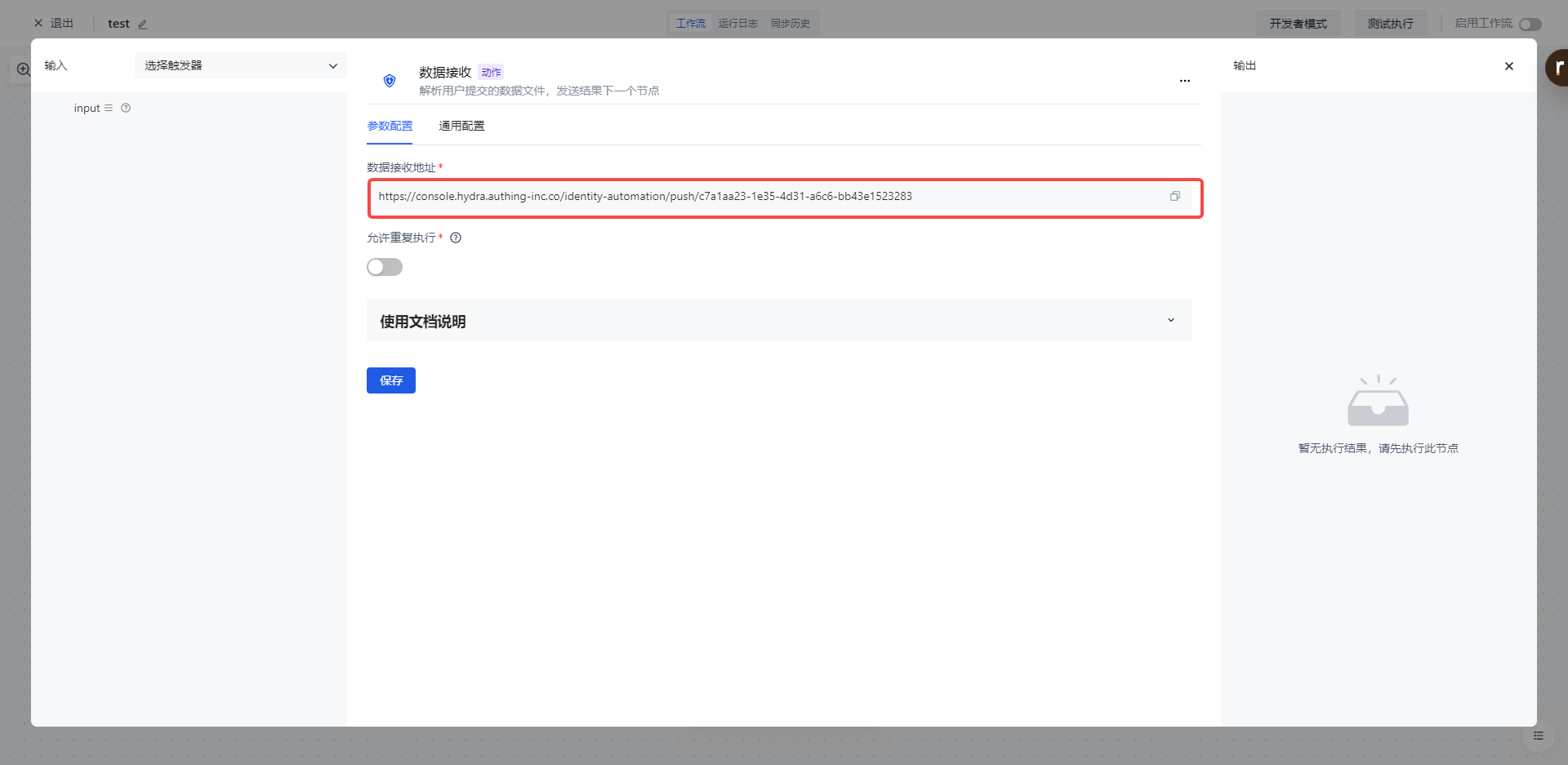 • 数据接收地址,用户推送数据文件的地址,当工作流运行到此节点时,会拉取你最近一次的上传数据,作为此节点的输出。