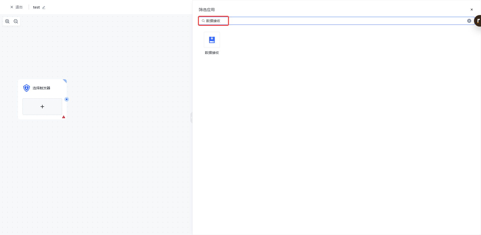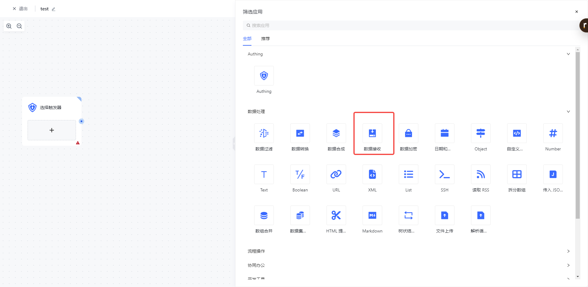 在添加节点页面,在「数据处理」分类中找到「数据接收」应用节点。