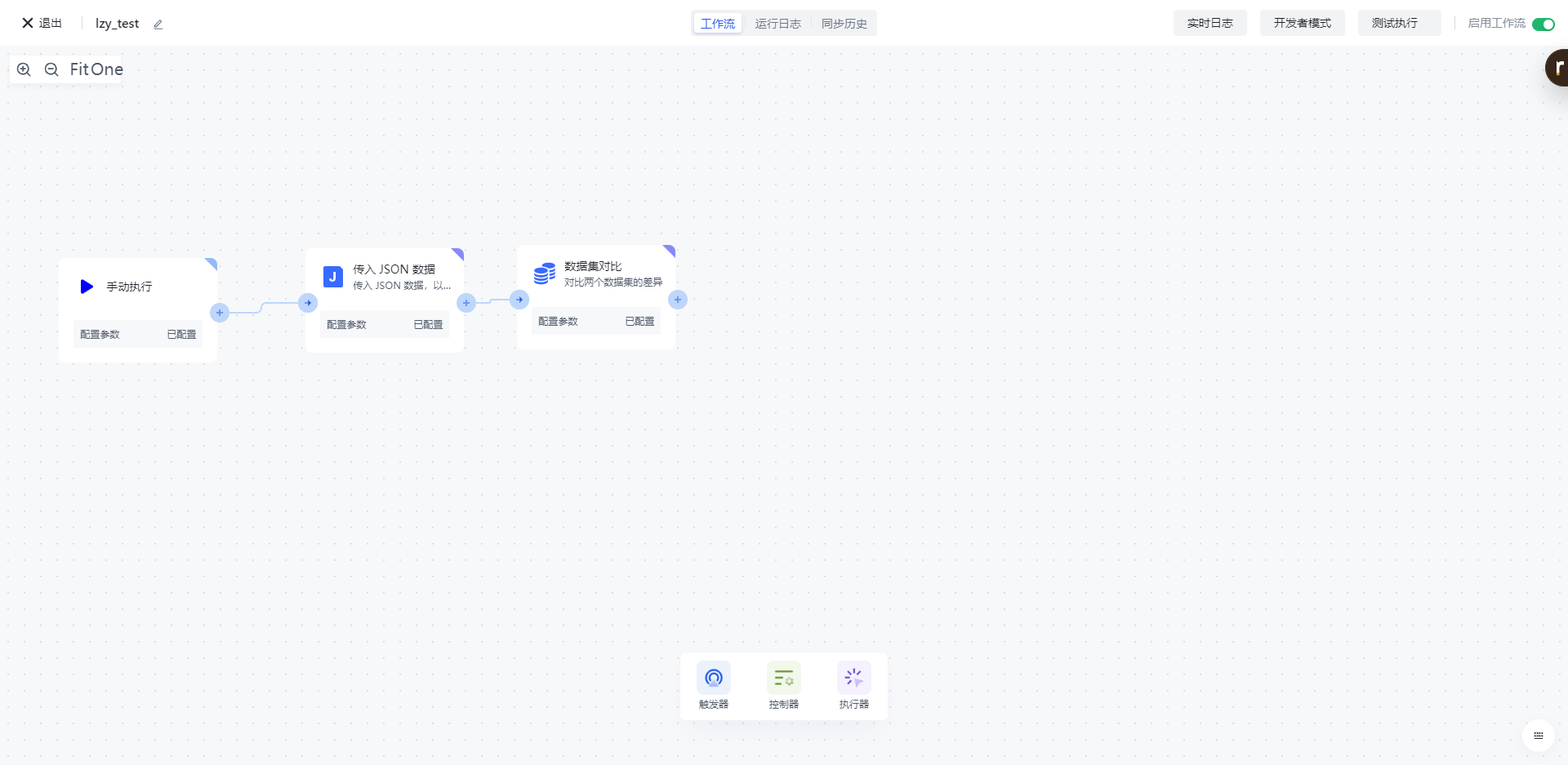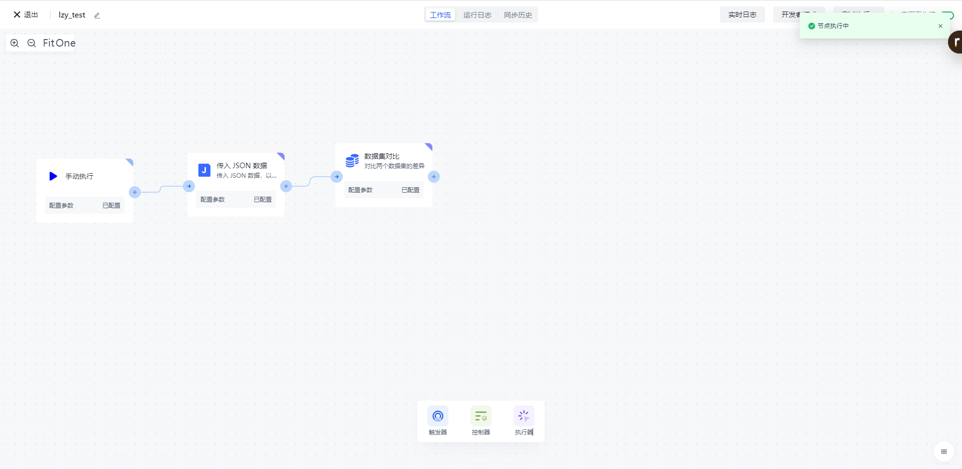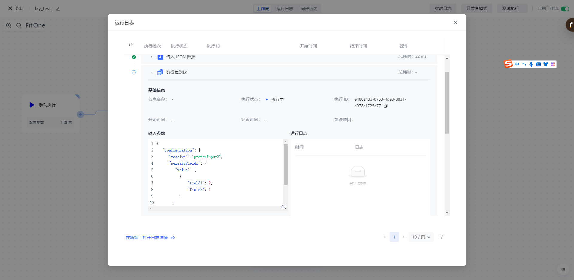 点击「运行日志」栏,依次点击最新的「执行批次」和「数据集对比」节点左边的展开按钮,查看节点执行结果。