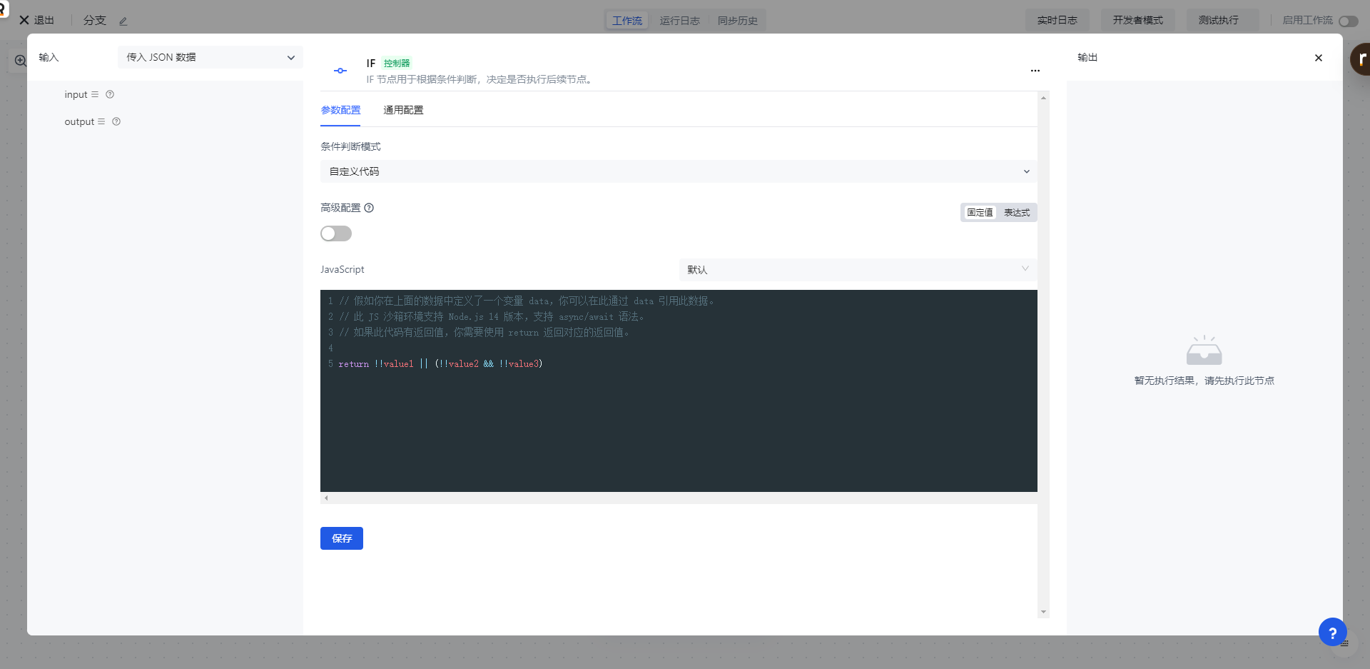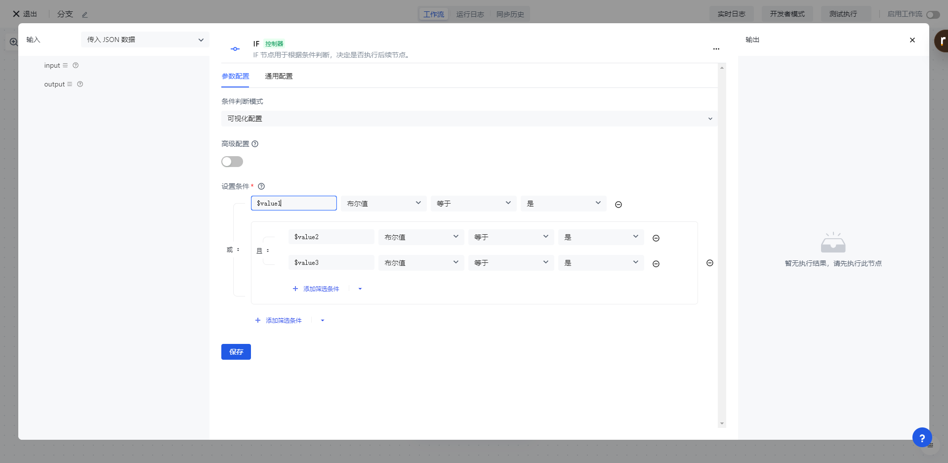 使用这种模式,可以配置非常灵活的 AND、OR 逻辑,同时支持条件组。先在设置运行变量中添加变量,值可以装配之前任意节点的数据;设置的变量可以在设置条件的表达式模块中引用(在变量前加一个 $ 符号)。