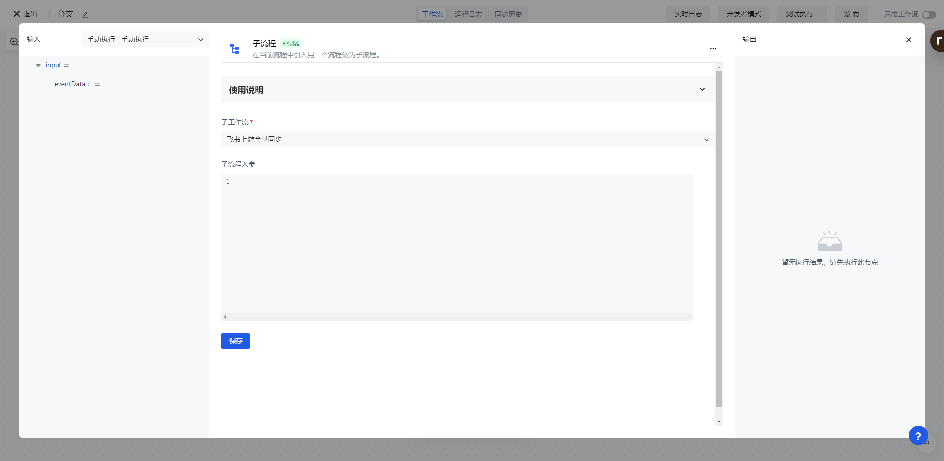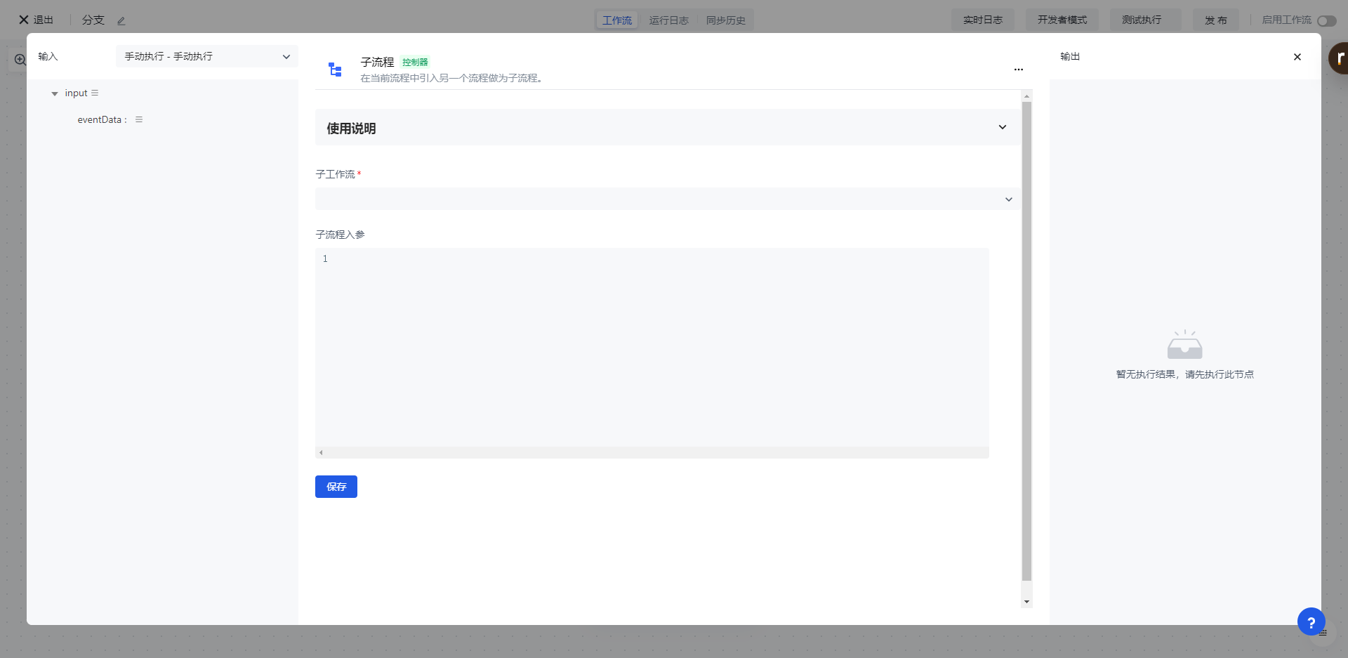 保存「子流程」配置之后,执行该工作流时,将会自动触发子工作流程,并且将「启动参数」(可选)作为子流程的输入参数。