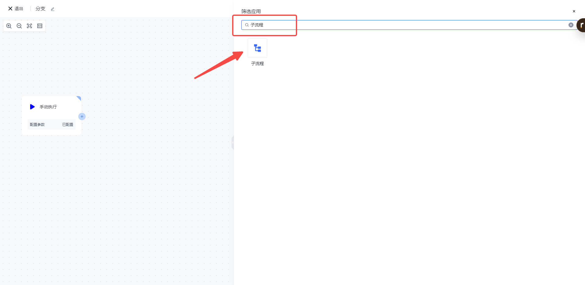 你可以在「流程操作」分类中找到「子流程」节点,也可以直接在应用搜索框内直接搜索 “子流程” 关键字。