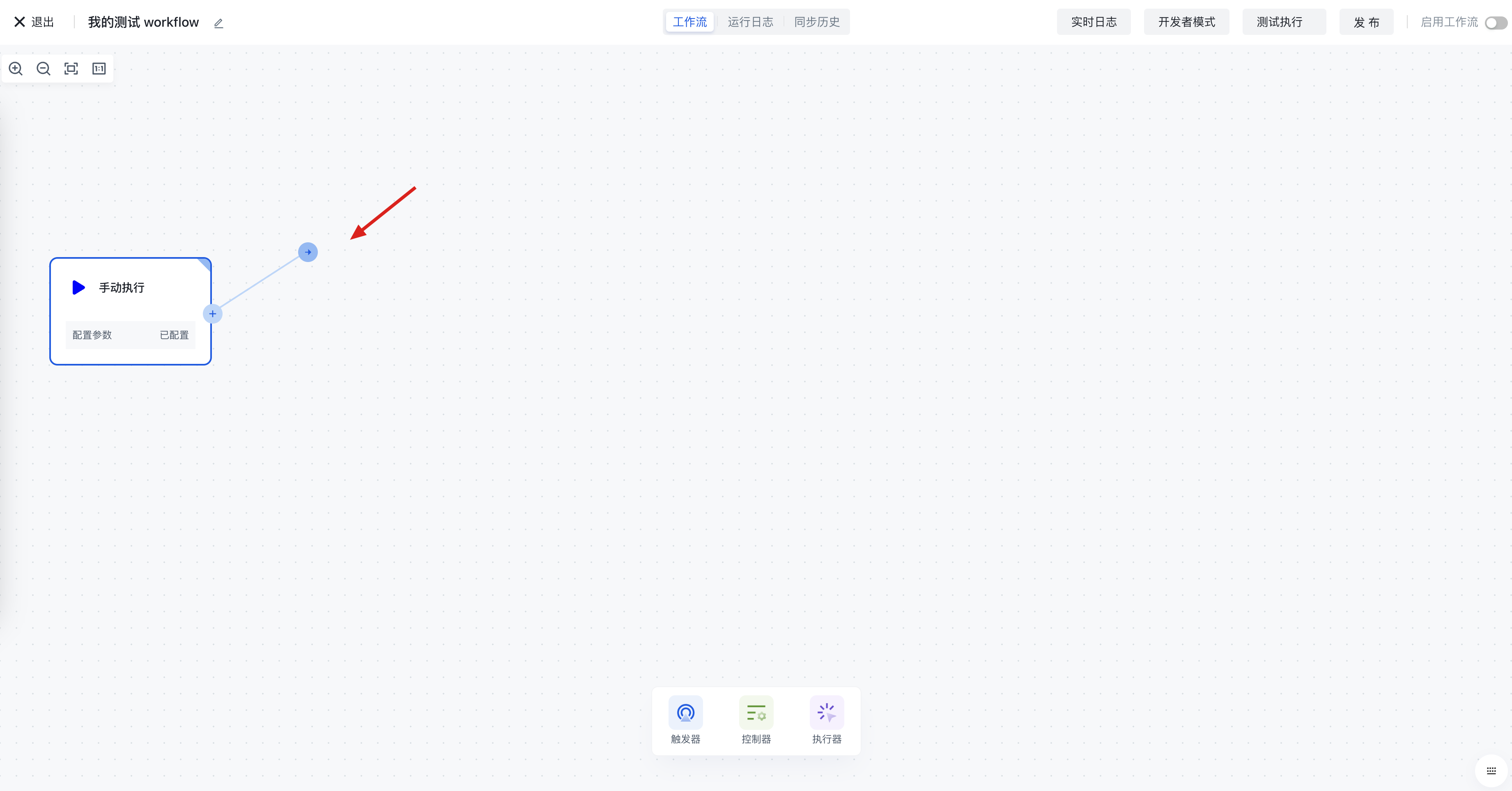 在任意节点的的右侧,有一个圆点按钮,将鼠标 hover 到此圆点上方,可以拖出一条连线用于添加新的节点: