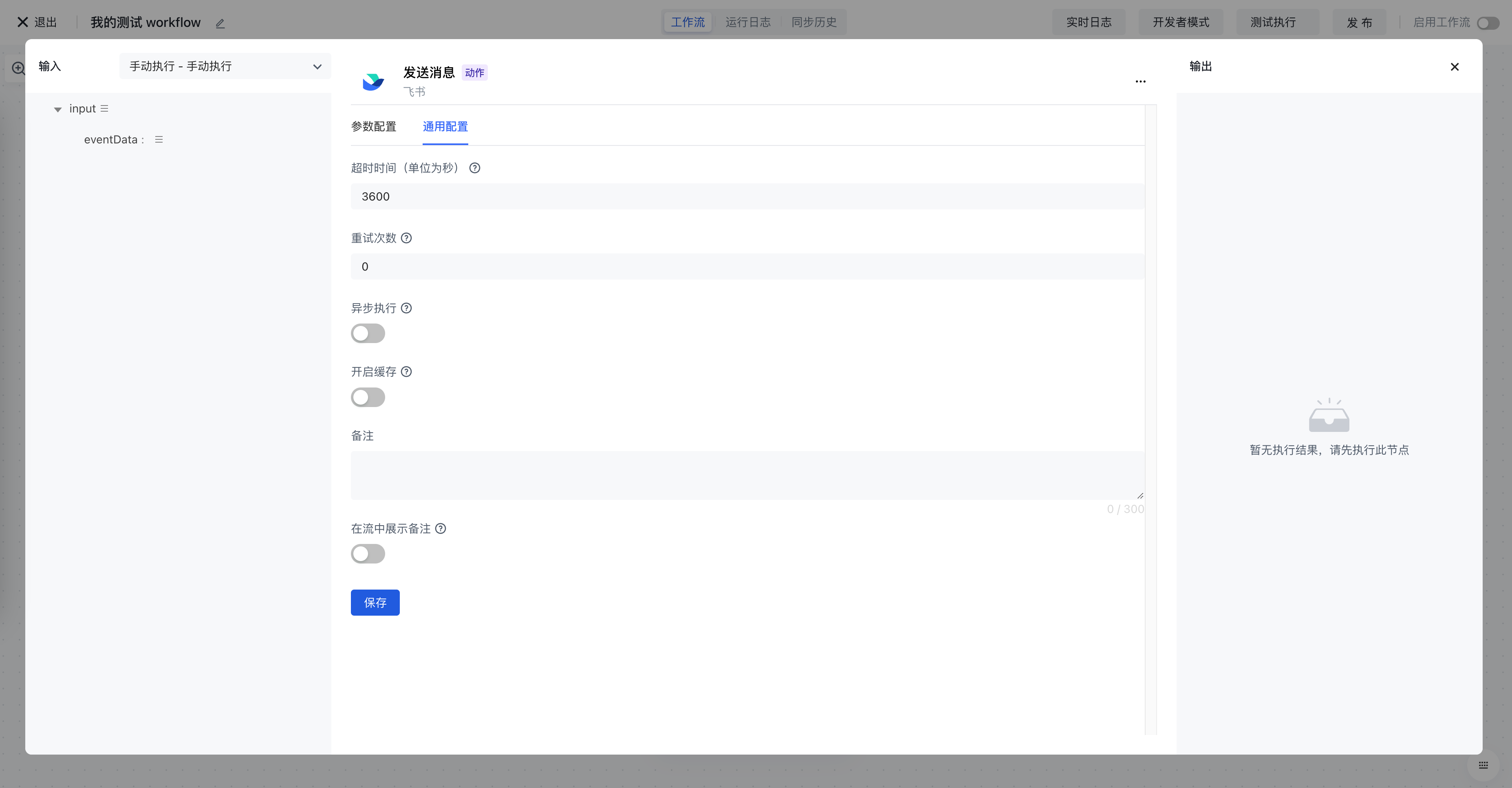 异步执行:开启之后,此节点将会异步执行,不会阻塞其他节点的执行,此节点发生异常也不会导致整个流程失败。适用于发送通知、文件上传等场景。